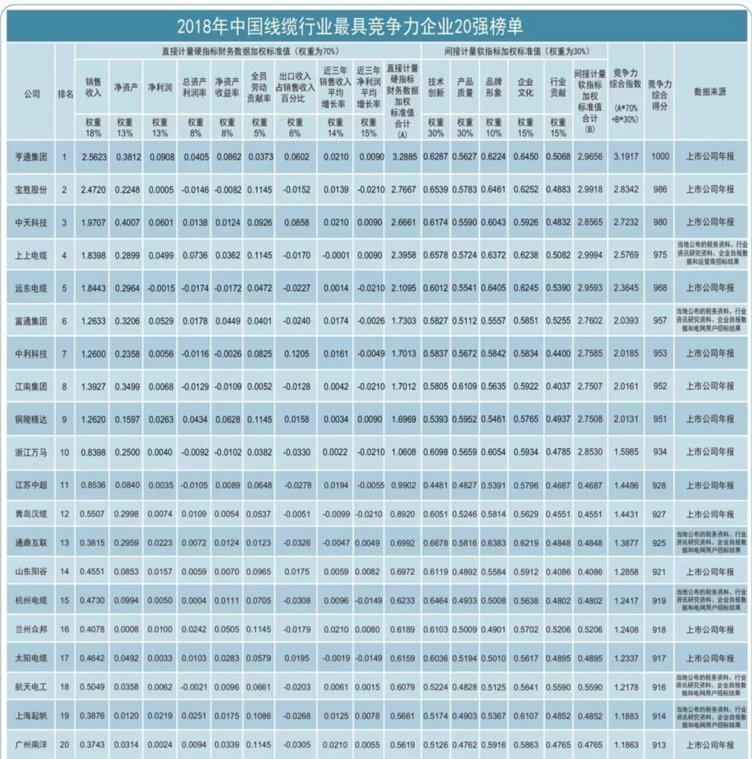 《2018年中國線纜產(chǎn)業(yè)100強(qiáng)》名單評(píng)選結(jié)果清晰顯示全國線纜企業(yè)競爭力態(tài)勢。從整體的競爭力表現(xiàn)來看,線纜行業(yè)整體競爭力表現(xiàn)比較平穩(wěn)。優(yōu)勢企業(yè)的基礎(chǔ)競爭力(直接計(jì)量硬指標(biāo)財(cái)務(wù)數(shù)據(jù))得分在相關(guān)子行業(yè)總排名的位次得到進(jìn)一步鞏固,亨通、寶勝、中天、上上、遠(yuǎn)東、富通等企業(yè)仍然保持領(lǐng)先, 上海起帆電纜等保持快速上升的態(tài)勢。