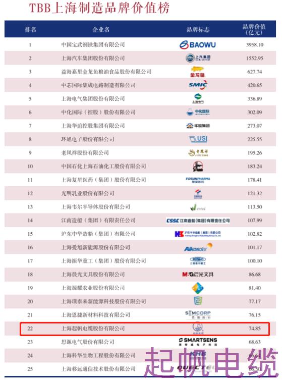 TBB上海制造業(yè)品牌價值榜入榜企業(yè)共104家,比上年增加11家,這些品牌價值上10億元的企業(yè)成功進入“十億俱樂部”;上海起帆品牌價值近75億元。